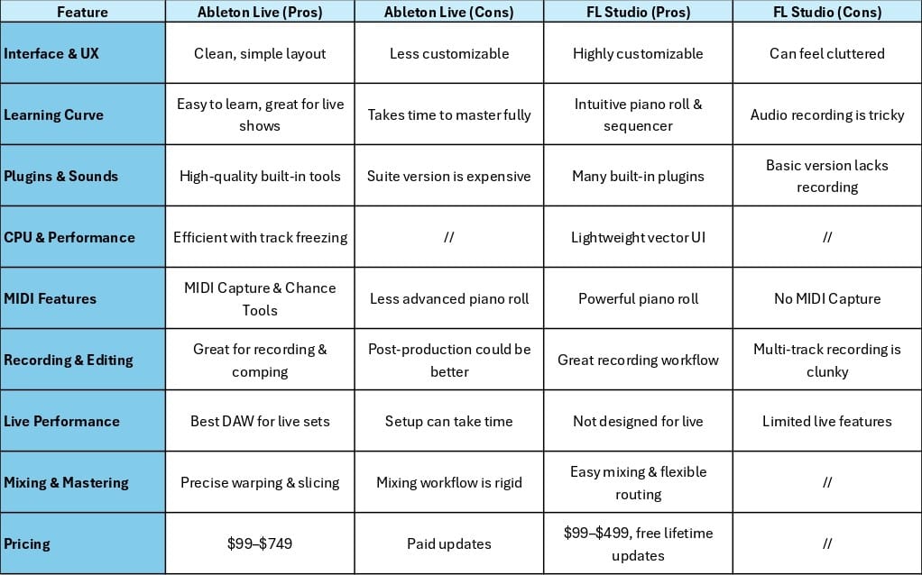 Far from me to tell you which one is better, I’ll conclude this article with a chart to summarise each DAW’s strong and weak points. I’ll leave it to you to decide which one can help you skyrocket your career. Have fun!