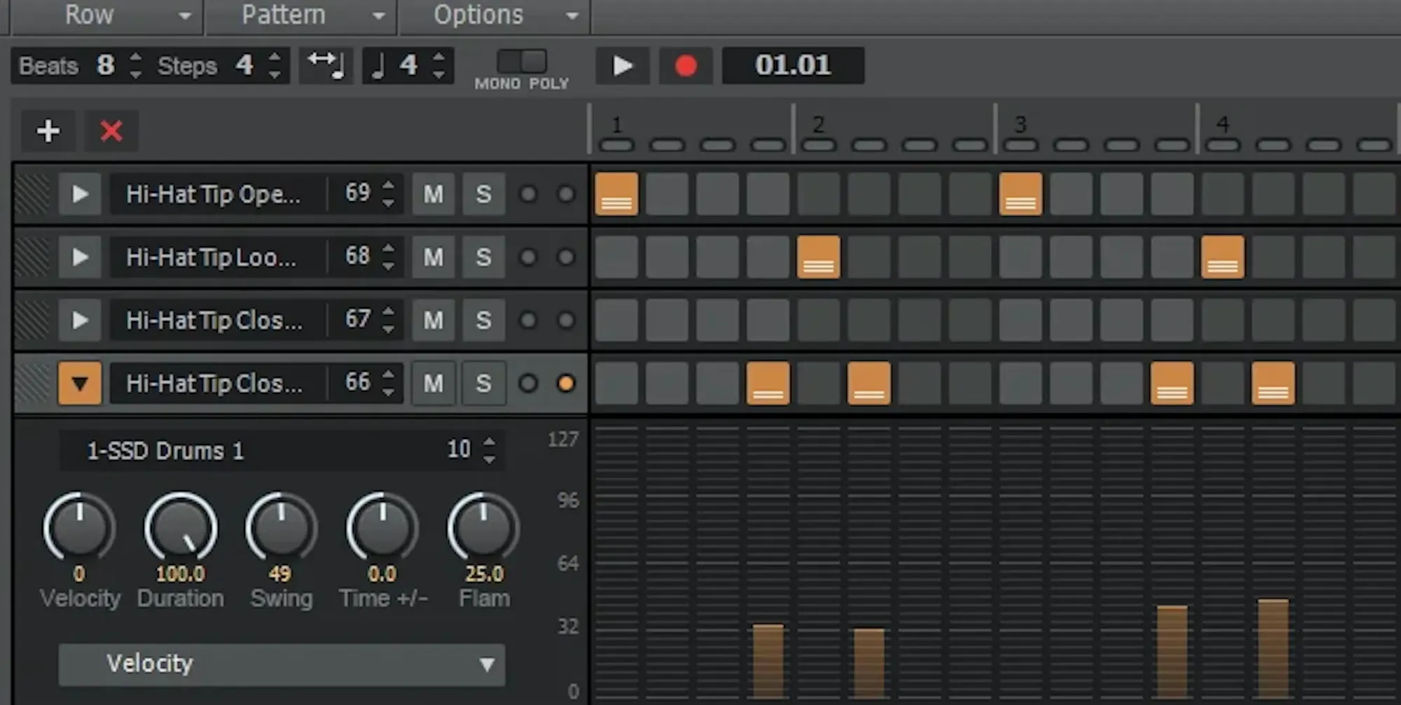 - Hi-hats: Program a steady 16th note hi-hat pattern for a driving, fast-paced rhythm.